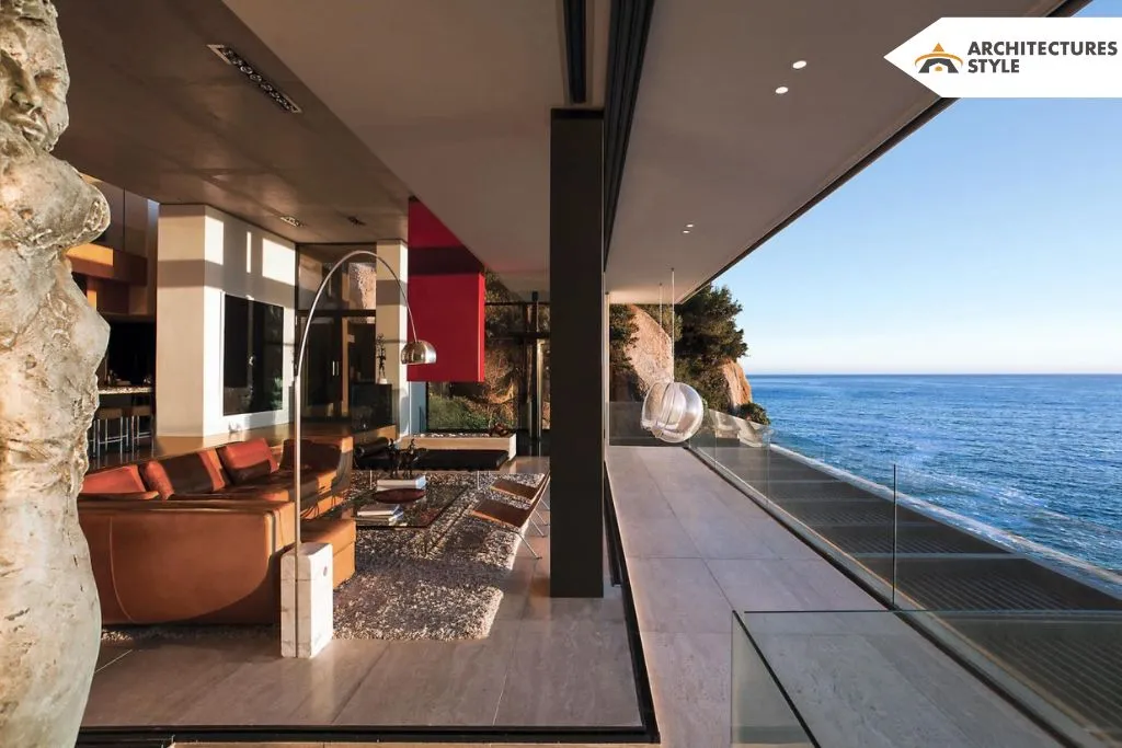 It relates straightforwardly to the sweeping ocean see and is outlined by the splendid red rectangular chimney stack vent and a Nero Marquina marble-clad divider. The dining space opens out onto a nursery patio with a water highlight and figure. A couple of steps lead down to the glass-fronted wine basement set straightforwardly under the main room’s examination, which neglects this whole spatial volume.