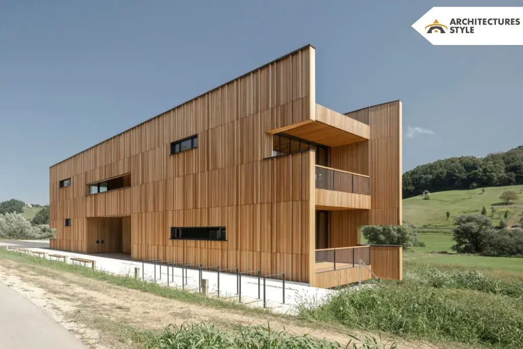 The Construction above the foundations is wooden. Layered but compact architectural visual with wooden facade and wooden platforms, which is textured with rhythms and raster, interprets vernacular architecture and connects to the natural and cultural landscape. Beaver Center By Ravnikar Potokar also known as a `wooden container pavilion` is placed amidst the landscape depending on the principle of extended-screen-barrier ‘, which also supports the idea of `objective observation of Nature`.