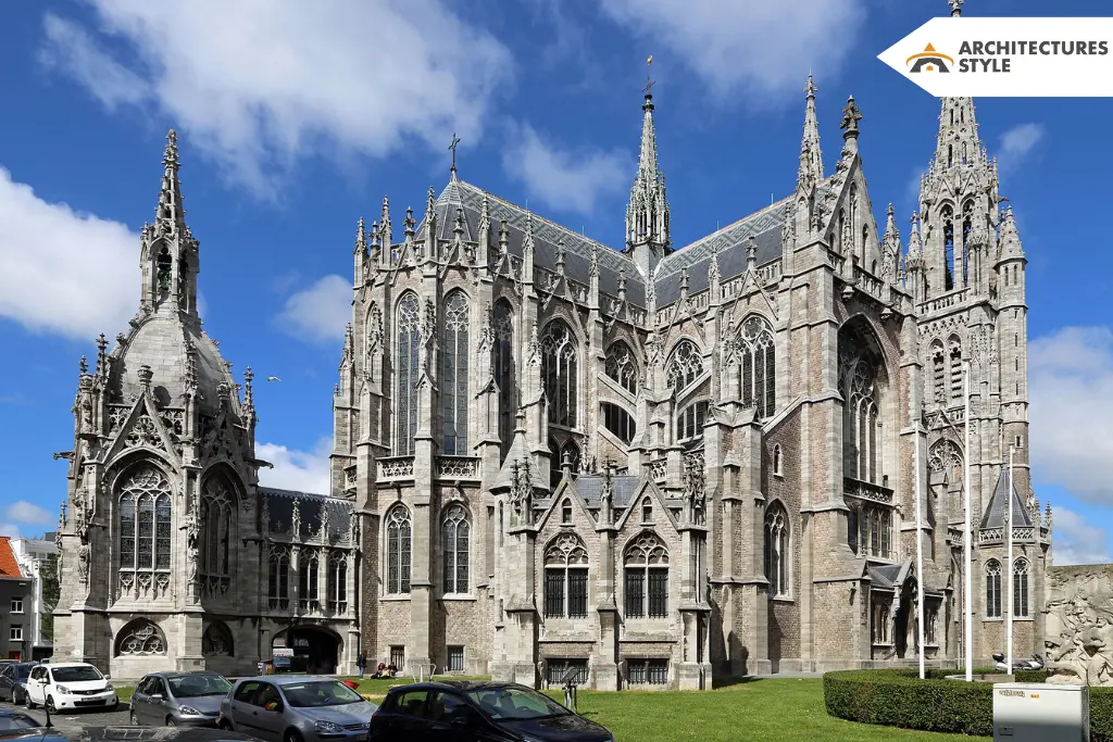 Although its cruciform design, raised nave, transept, and tower were inspired by Romanesque architecture from the 11th century, its pointed arches, ornate embellishments, and rib vaulting were essentially Gothic.