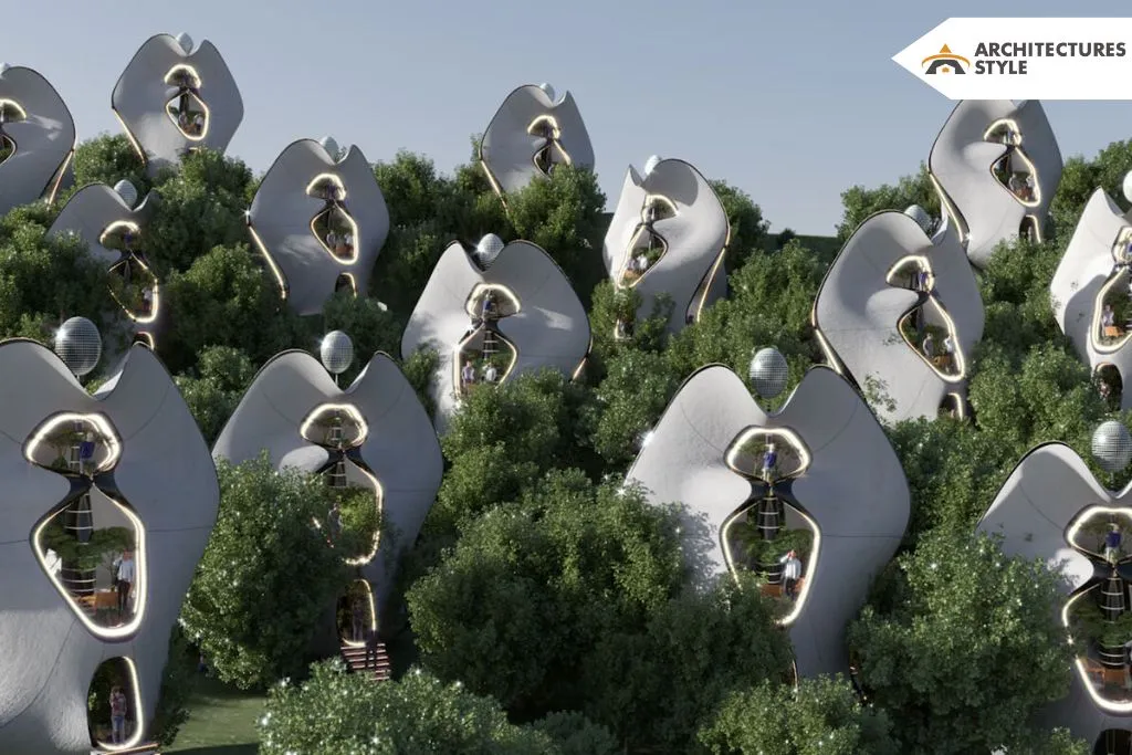 Every unit accommodates hollow-core columns implanted one-third into the ground, as well as numerous organic branches that flow out to support the three levels of the structure. For every story, a boundary frame splits and holds the facades, which are made up of panels designed to fit the house’s organic, flowing contour.
