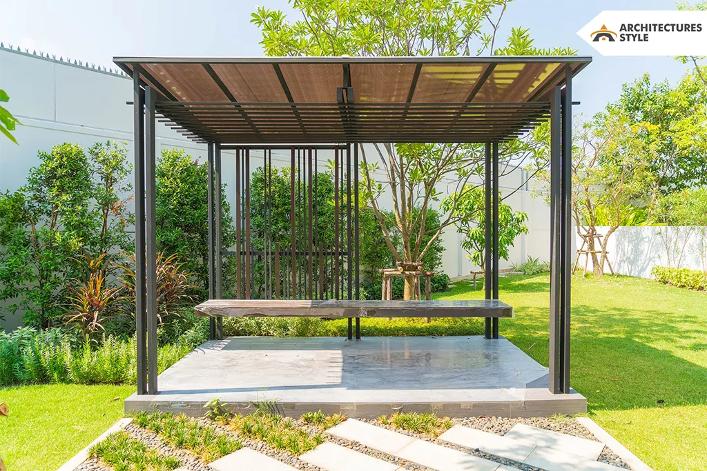Looking for something different and edgy? Get a metallic pergola installed and make it just the perfect and edgy adornment for your backyard. Finish up the decor with concrete flooring and metallic accents for a glam vibe.