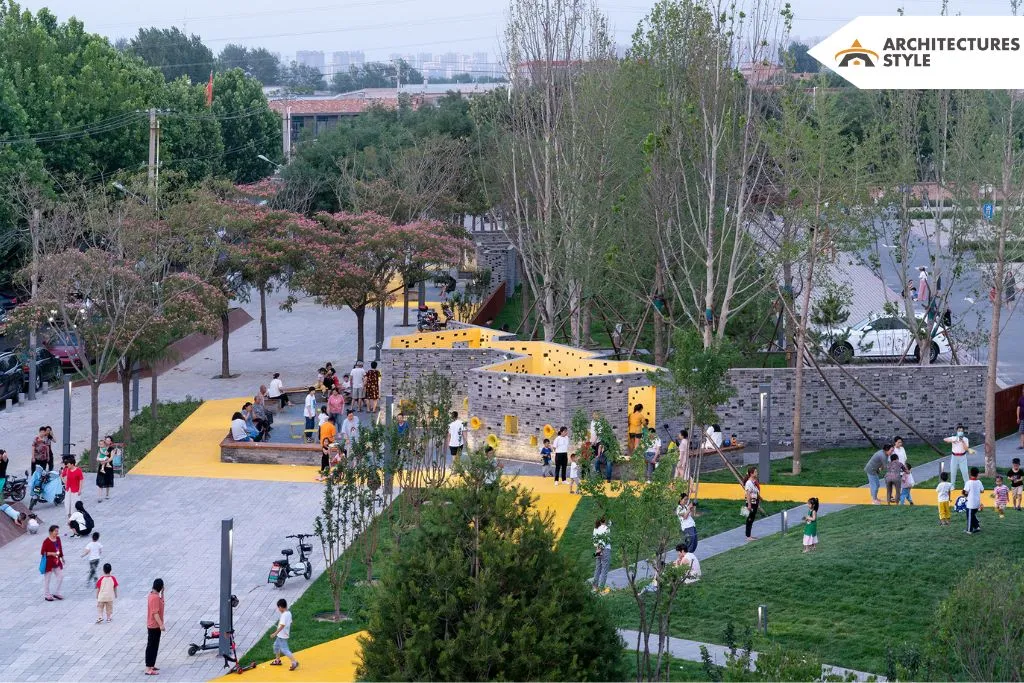 Persian silk trees are planted in large flower pots framed by sloped weathering steel on the side of the street. They provide a natural buffering belt that separates busy highways from public places while also growing new and old trees. The mature trees (Hibiscus trees, for example) are blended and embedded in little castle unique floor tiles that have been reused. In the transformation process, the park’s floor tiles keep the traditional recollections. The bricks are antiques, and the patterns on them are inspired by the phrase “little castle.”