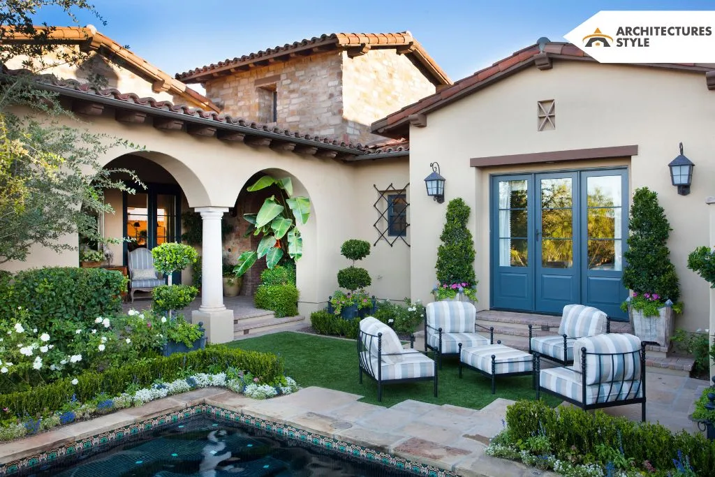 Spanish architecture includes half arched shape, flat tiled roof, and exposed wooden beams.