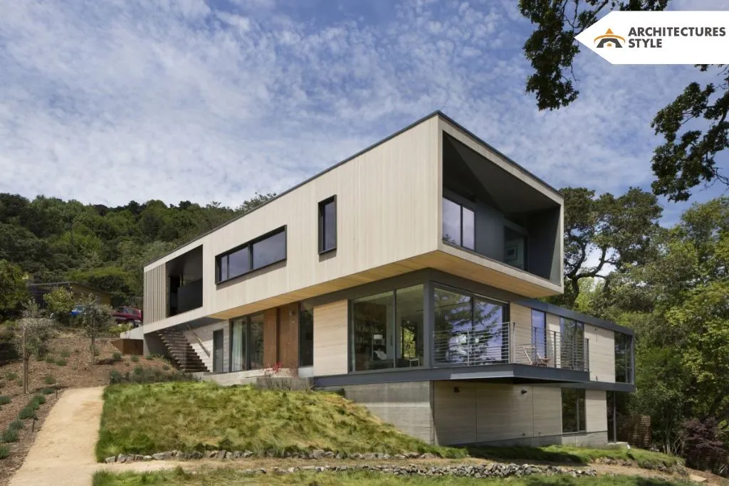 This house is a perfect example of A modern cantilevered house. This house is painted grey and is one lovely dwelling in the middle of trees. The use of timber softens the atmosphere. Because of its mass solidity and firmness, it is very modern and classy.